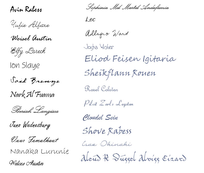 ウチで一番字が巧いのは遵稜なんですが、欧文系の人たちの中では、ニーアが一番綺麗です。あと、ベリアとかヴュールとか。反対に下手なのがナナカ。名前短くて判りにくいけど、リエスも余り巧くないです。あと、イオンは可愛いから、とか言って書けるくせに筆記体書かない。ソイルが癖字なのは左利き(Leftyというフォントなのです。笑)な所為。ジュノウは姉から人間の字を教わったので、ちょっと女字くさい…とか、考えると楽しくなってきてですね。元々は、アヴィンって依頼書とかにサインするときどんな字かなーって、ぼんやり思ったのが最初なんですけど。なんか、もう決めずには居られないんですよね…(笑)